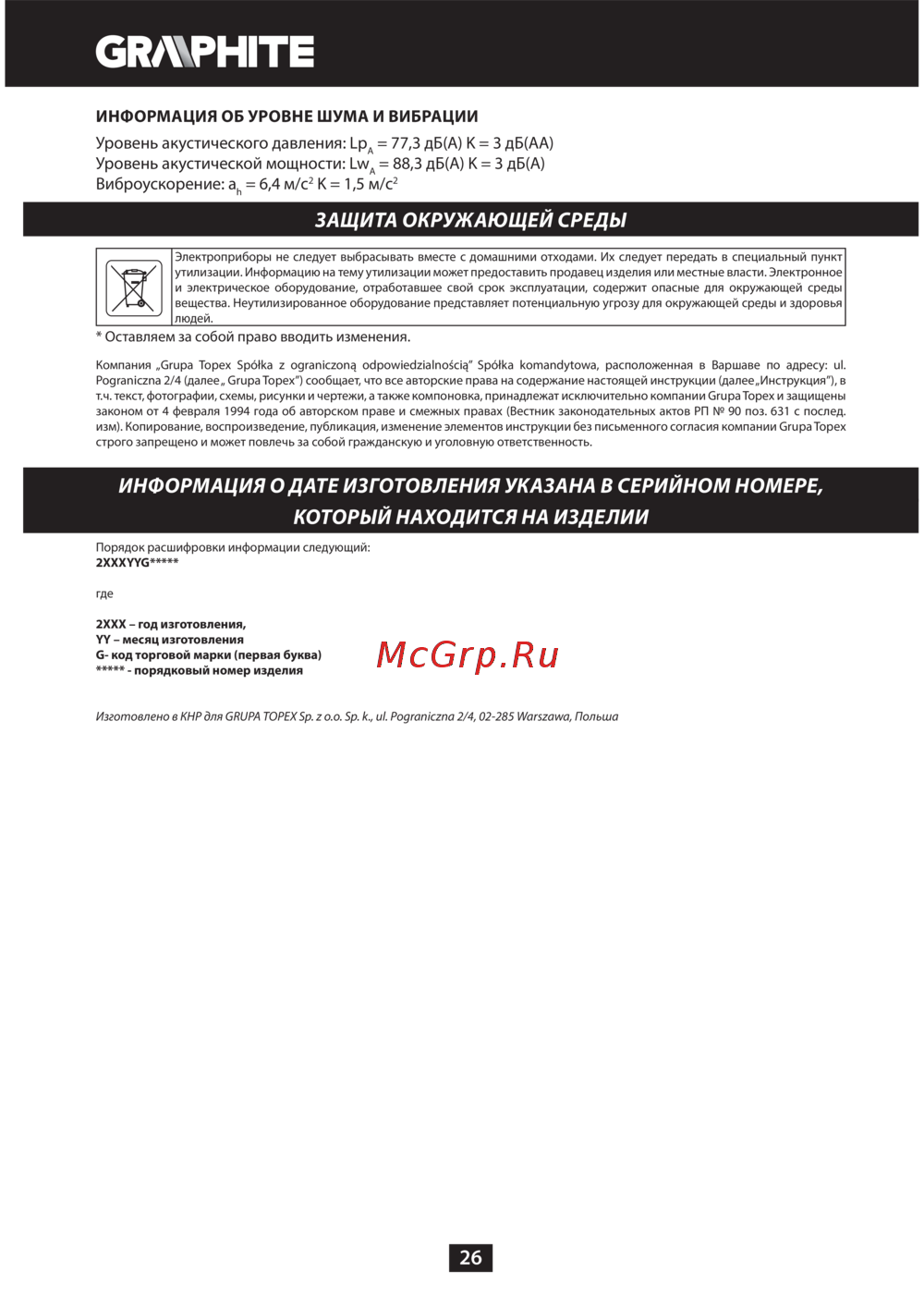 - Информация о дате изготовления указана в серийном номере который находится на изделии p.26