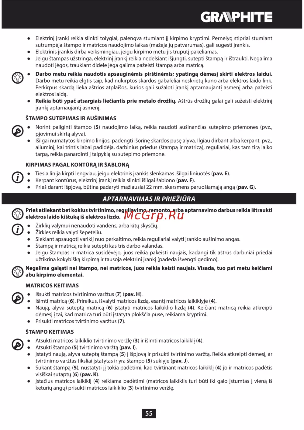 GRAPHITE 59G401 — elektrinių įrankių naudojimo ir priežiūros rekomendacijos [55/104]
