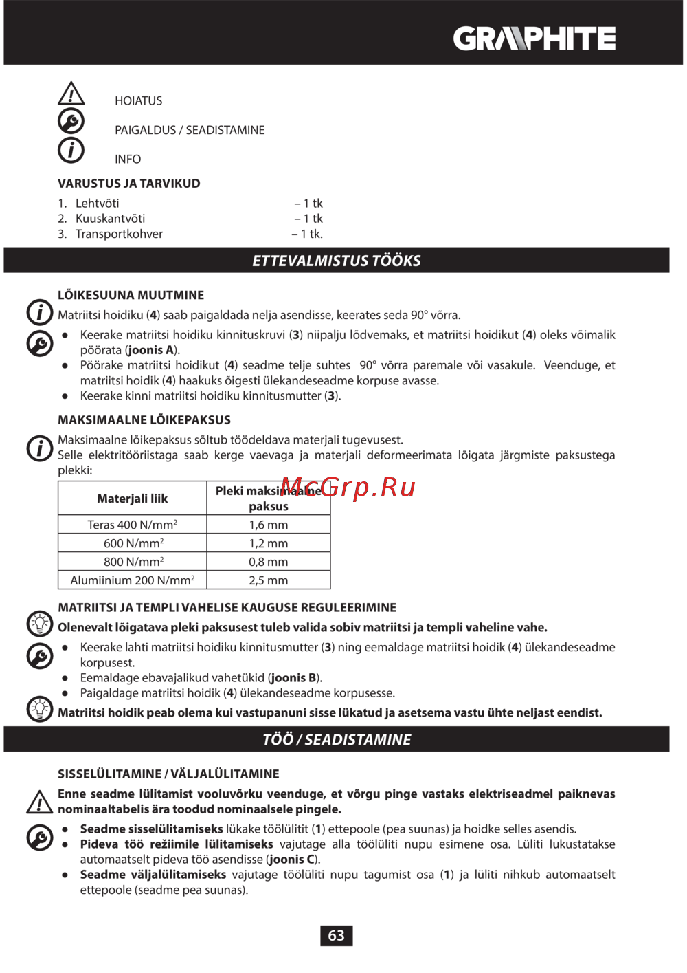 GRAPHITE 59G401 — paigaldus ja seadistamine elektritööriistade jaoks [63/104]