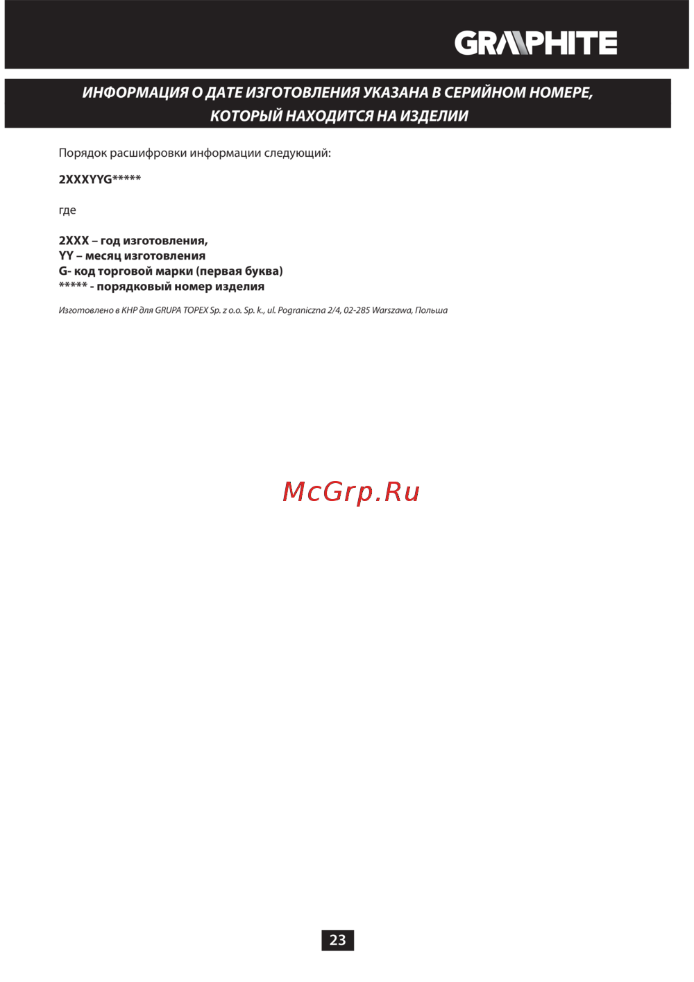 GRAPHITE 58G718 [23/88] Информация о дате изготовления указана в серийном номере который находится на изделии