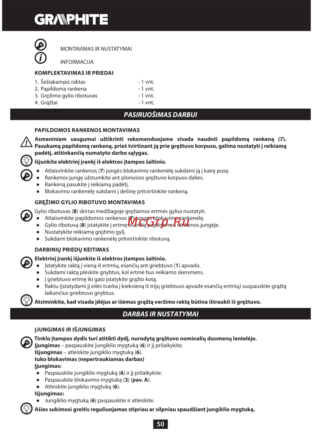 ![GRAPHITE 58G718 [50/88] Pasiruošimas darbui](/views2/1382136/page50/bg32.png)