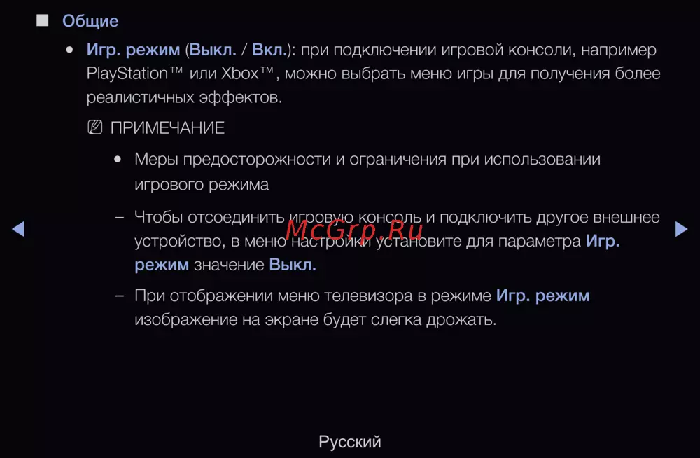 Игр. режим (Выкл. / Вкл.): при подключении игровой консоли, например