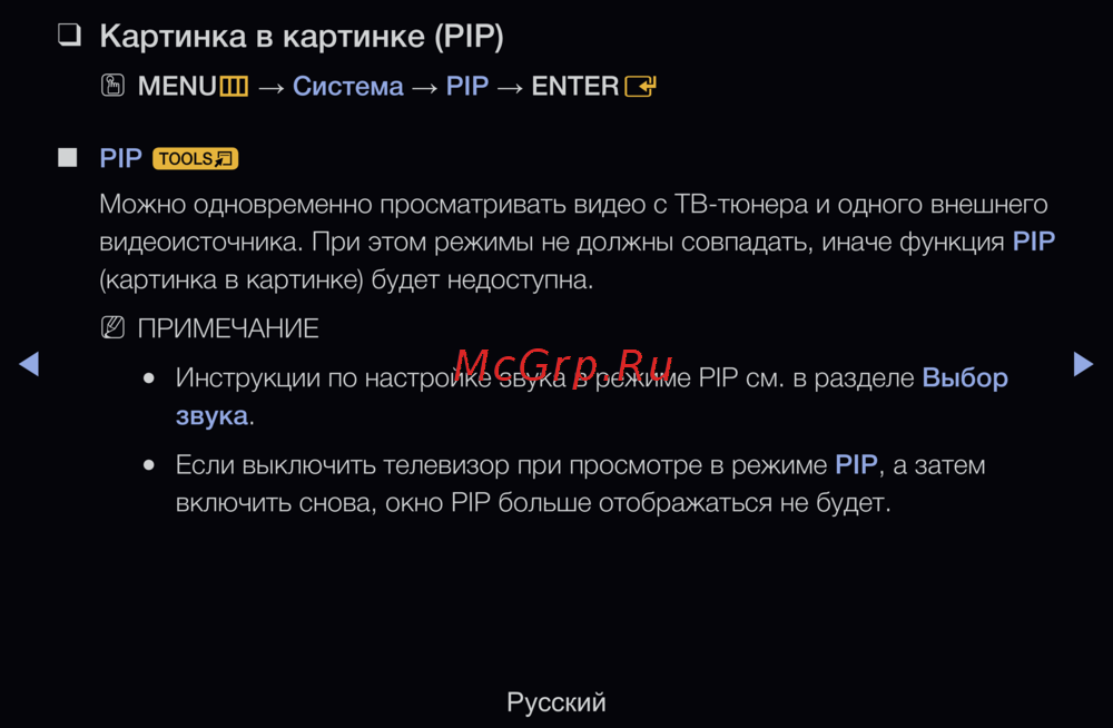 Инструкции по настройке звука в режиме PIP см. в разделе Выбор