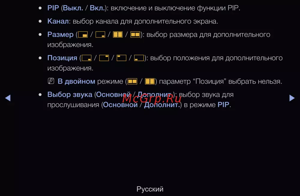 прослушивания (Основной / Дополнит.) в режиме PIP.