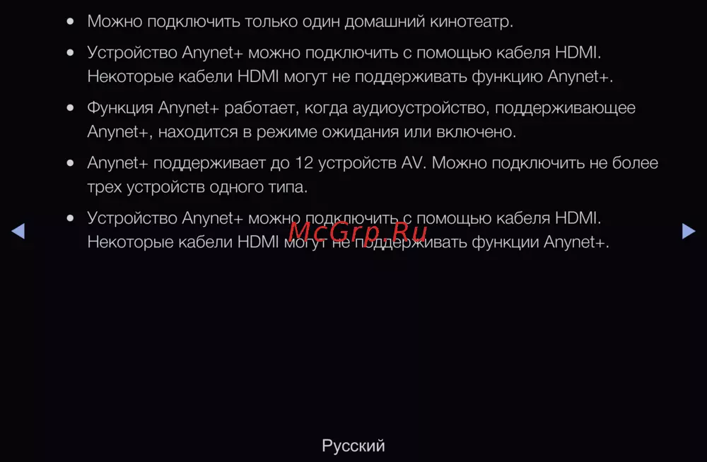 Anynet+ поддерживает до 12 устройств AV. Можно подключить не более