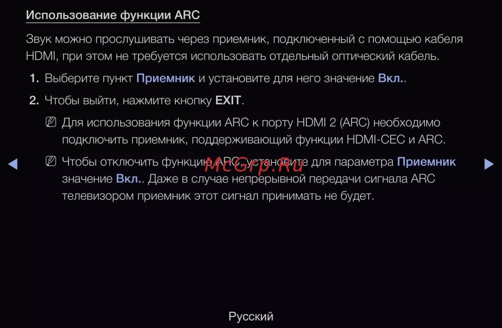 Чтобы отключить функцию ARC, установите для параметра Приемник