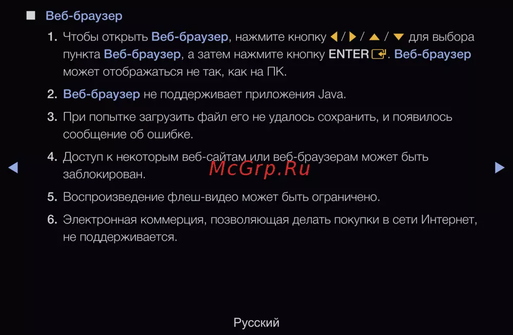 Samsung UE-32 D6100SW — основные функции и ограничения веб-браузера на устройстве [274/318]