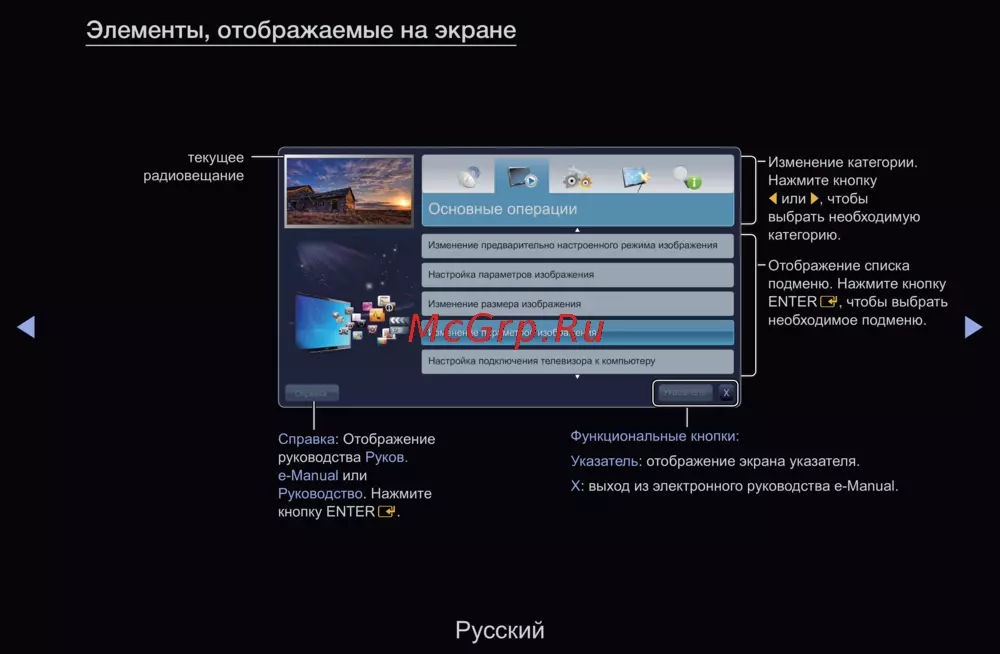 - Переход между экраном руководства e manual и соответствующими меню p.313