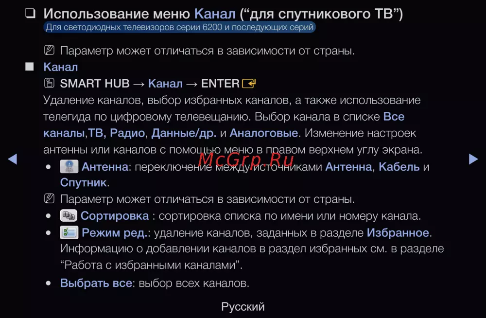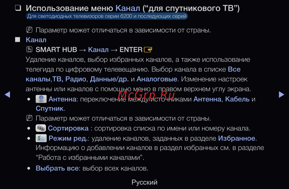 Узнайте, как использовать меню Канал для настройки и управления каналами на светодиодных телевизорах. Удаление, сортировка и выбор избранных каналов.