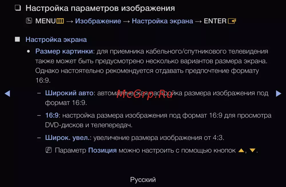 Узнайте, как правильно настроить параметры изображения для кабельного и спутникового телевидения. Рекомендуем использовать формат 16:9 для лучшего качества.