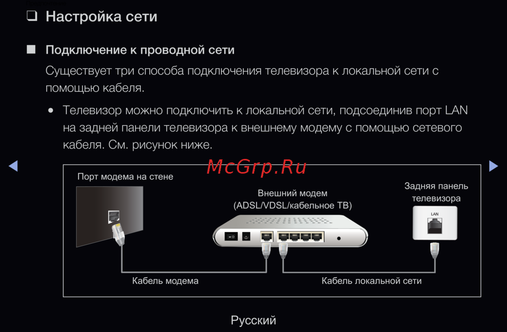 на задней панели телевизора к внешнему модему с помощью сетевого