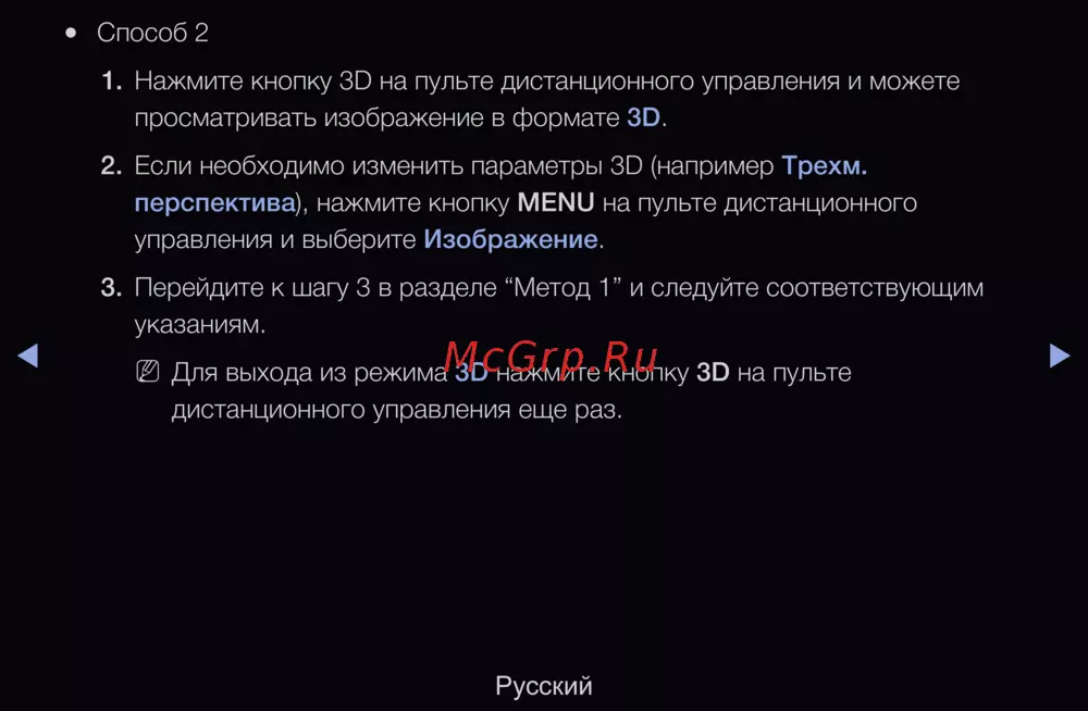 Для выхода из режима 3D нажмите кнопку 3D на пульте