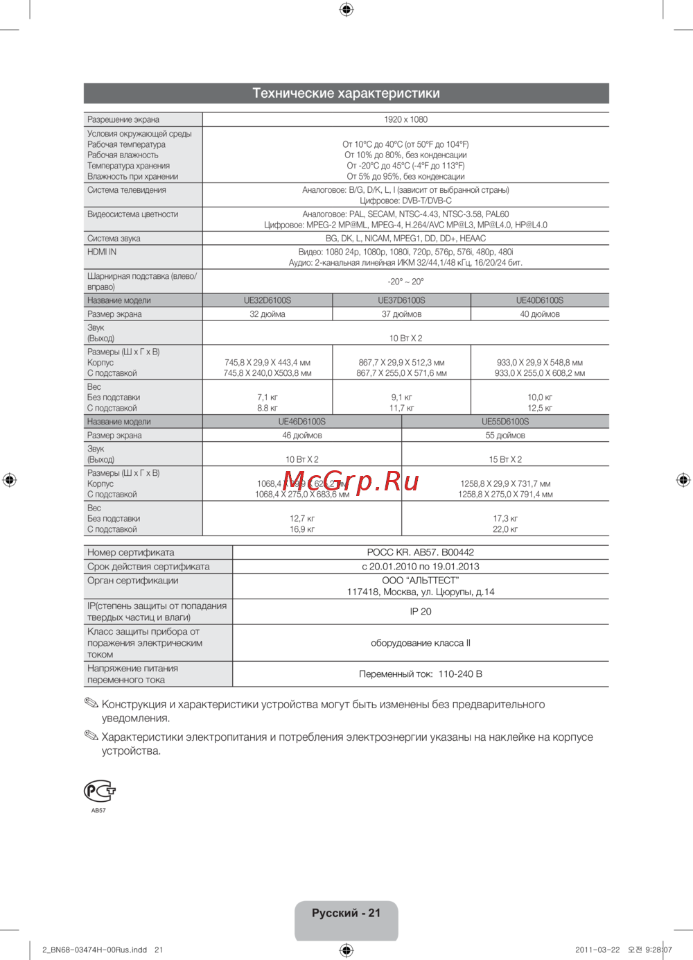 Samsung UE-46 D6100SW [21/340] Технические характеристики
