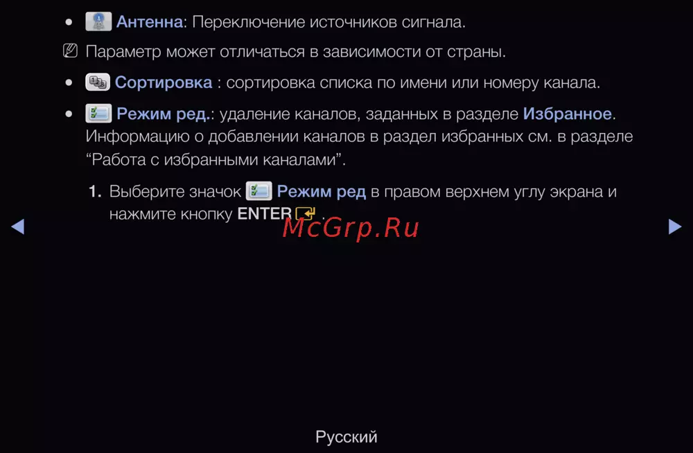Режим ред.: удаление каналов, заданных в разделе Избранное.