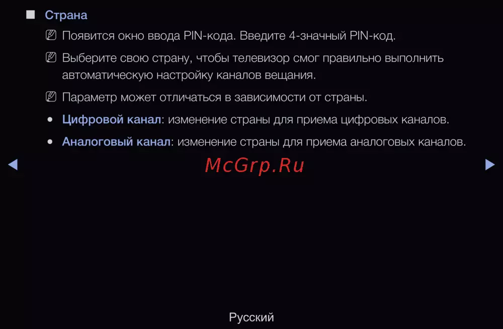 Аналоговый канал: изменение страны для приема аналоговых каналов.
