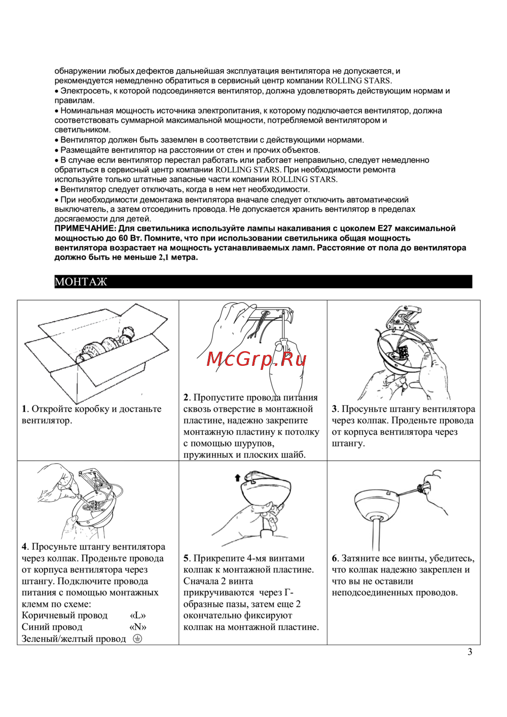 обнаружении любых дефектов дальнейшая эксплуатация вентилятора не допускается и рекомендуется немедленно обратиться в сервисный центр компании ROLLING STARS Электросеть к которой подсоединяется вентилятор должна удовлетворять действующим нормам и правилам Номинальная мощность источника электропитания к которому подключается вентилятор должна соответствовать суммарной максимальной мощности потребляемой вентилятором и светильником Вентилятор должен быть заземлен в соответствии с действующими нормами Размещайте вентилятор на расстоянии от стен и прочих объектов В случае если вентилятор перестал работать или работает неправильно следует немедленно обратиться в сервисный центр компании ROLLING STARS При необходимости ремонта используйте только штатные запасные части компании ROLLING STARS Вентилятор следует отключать когда в нем нет необходимости При необходимости демонтажа вентилятора вначале следует отключить автоматический выключатель а затем отсоединить провода Не допускается хранить вентилятор в пределах досягаемости для детей ПРИМЕЧАНИЕ Для светильника используйте лампы накаливания с цоколем Е27 максимальной мощностью до 60 Вт Помните что при использовании светильника общая мощность вентилятора возрастает на мощность устанавливаемых ламп Расстояние от пола до вентилятора должно быть не меньше 2 1 метра МОНТАЖ 1 Откройте коробку и достаньте вентилятор 4 Просуньте штангу вентилятора через колпак Проденьте провода от корпуса вентилятора через штангу Подключите провода питания с помощью монтажных клемм по схеме Коричневый провод Ь Синий провод И Зеленый желтый провод 2 2 Пропустите провода питания сквозь отверстие в монтажной пластине надежно закрепите монтажную пластину к потолку с помощью шурупов пружинных и плоских шайб 5 Прикрепите 4 мя винтами колпак к монтажной пластине Сначала 2 винта прикручиваются через Г образные пазы затем еще 2 окончательно фиксируют колпак на монтажной пластине 3 Просуньте штангу вентилятора через колпак Проденьте провода от корпуса вентилятора через штангу 6 Затяните все винты убедитесь что колпак надежно закреплен и что вы не оставили неподсоединенных проводов 3