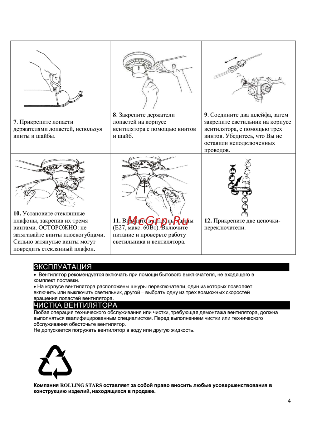 7 Прикрепите лопасти держателями лопастей используя винты и шайбы 10 Установите стеклянные плафоны закрепив их тремя винтами ОСТОРОЖНО не затягивайте винты плоскогубцами Сильно затянутые винты могут повредить стеклянный плафон 8 Закрепите держатели лопастей на корпусе вентилятора с помощью винтов и шайб 9 Соедините два шлейфа затем закрепите светильник на корпусе вентилятора с помощью трех винтов Убедитесь что Вы не оставили неподключенных проводов 11 Вкрутите в патроны лампы Е27 макс 60Вт Включите питание и проверьте работу светильника и вентилятора 12 Прикрепите две цепочкипереключатели ЭКСПЛУАТАЦИЯ Вентилятор рекомендуется включать при помощи бытового выключателя не входящего в комплект поставки На корпусе вентилятора расположены шнуры переключатели один из которых позволяет включить или выключить светильник другой выбрать одну из трех возможных скоростей вращения лопастей вентилятора ___________________________________________________ ЧИСТКА ВЕНТИЛЯТОРА Любая операция технического обслуживания или чистки требующая демонтажа вентилятора должна выполняться квалифицированным специалистом Перед выполнением чистки или технического обслуживания обесточьте вентилятор Не допускается погружать вентилятор в воду или другую жидкость Компания ROLLING STARS оставляет за собой право вносить любые усовершенствования в конструкцию изделий находящихся в продаже 4