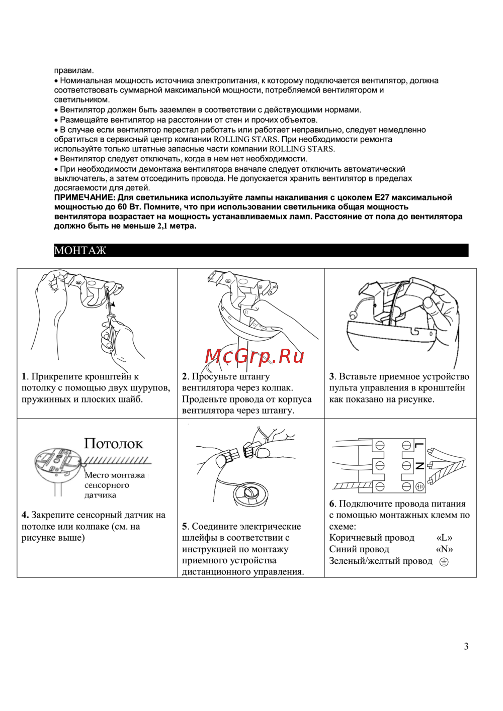 правилам Номинальная мощность источника электропитания к которому подключается вентилятор должна соответствовать суммарной максимальной мощности потребляемой вентилятором и светильником Вентилятор должен быть заземлен в соответствии с действующими нормами Размещайте вентилятор на расстоянии от стен и прочих объектов В случае если вентилятор перестал работать или работает неправильно следует немедленно обратиться в сервисный центр компании ROLLING STARS При необходимости ремонта используйте только штатные запасные части компании ROLLING STARS Вентилятор следует отключать когда в нем нет необходимости При необходимости демонтажа вентилятора вначале следует отключить автоматический выключатель а затем отсоединить провода Не допускается хранить вентилятор в пределах досягаемости для детей ПРИМЕЧАНИЕ Для светильника используйте лампы накаливания с цоколем Е27 максимальной мощностью до 60 Вт Помните что при использовании светильника общая мощность вентилятора возрастает на мощность устанавливаемых ламп Расстояние от пола до вентилятора должно быть не меньше 2 1 метра МОНТАЖ 1 Прикрепите кронштейн к потолку с помощью двух шурупов пружинных и плоских шайб 4 Закрепите сенсорный датчик на потолке или колпаке см на рисунке выше вентилятора через колпак Проденьте провода от корпуса вентилятора через штангу 5 Соедините электрические шлейфы в соответствии с инструкцией по монтажу приемного устройства дистанционного управления 3 Вставьте приемное устройство пульта управления в кронштейн как показано на рисунке 6 Подключите провода питания с помощью монтажных клемм по схеме Коричневый провод Ь Синий провод К Зеленый желтый провод 3