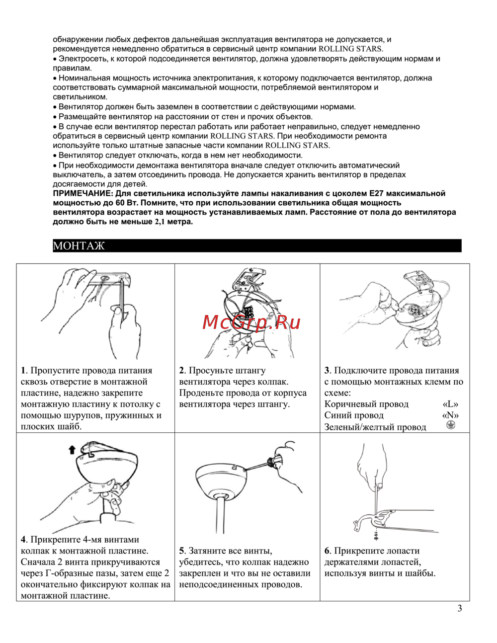 обнаружении любых дефектов дальнейшая эксплуатация вентилятора не допускается и рекомендуется немедленно обратиться в сервисный центр компании ROLLING STARS Электросеть к которой подсоединяется вентилятор должна удовлетворять действующим нормам и правилам Номинальная мощность источника электропитания к которому подключается вентилятор должна соответствовать суммарной максимальной мощности потребляемой вентилятором и светильником Вентилятор должен быть заземлен в соответствии с действующими нормами Размещайте вентилятор на расстоянии от стен и прочих объектов В случае если вентилятор перестал работать или работает неправильно следует немедленно обратиться в сервисный центр компании ROLLING STARS При необходимости ремонта используйте только штатные запасные части компании ROLLING STARS Вентилятор следует отключать когда в нем нет необходимости При необходимости демонтажа вентилятора вначале следует отключить автоматический выключатель а затем отсоединить провода Не допускается хранить вентилятор в пределах досягаемости для детей ПРИМЕЧАНИЕ Для светильника используйте лампы накаливания с цоколем Е27 максимальной мощностью до 60 Вт Помните что при использовании светильника общая мощность вентилятора возрастает на мощность устанавливаемых ламп Расстояние от пола до вентилятора должно быть не меньше 2 1 метра МОНТАЖ 1 Пропустите провода питания сквозь отверстие в монтажной пластине надежно закрепите монтажную пластину к потолку с помощью шурупов пружинных и плоских шайб 4 Прикрепите 4 мя винтами колпак к монтажной пластине Сначала 2 винта прикручиваются через Г образные пазы затем еще 2 окончательно фиксируют колпак на монтажной пластине 2 Просуньте штангу вентилятора через колпак Проденьте провода от корпуса вентилятора через штангу 3 Подключите провода питания с помощью монтажных клемм по схеме Коричневый провод Ь Синий провод N Зеленый желтый провод 5 Затяните все винты убедитесь что колпак надежно закреплен и что вы не оставили неподсоединенных проводов 6 Прикрепите лопасти держателями лопастей используя винты и шайбы 3