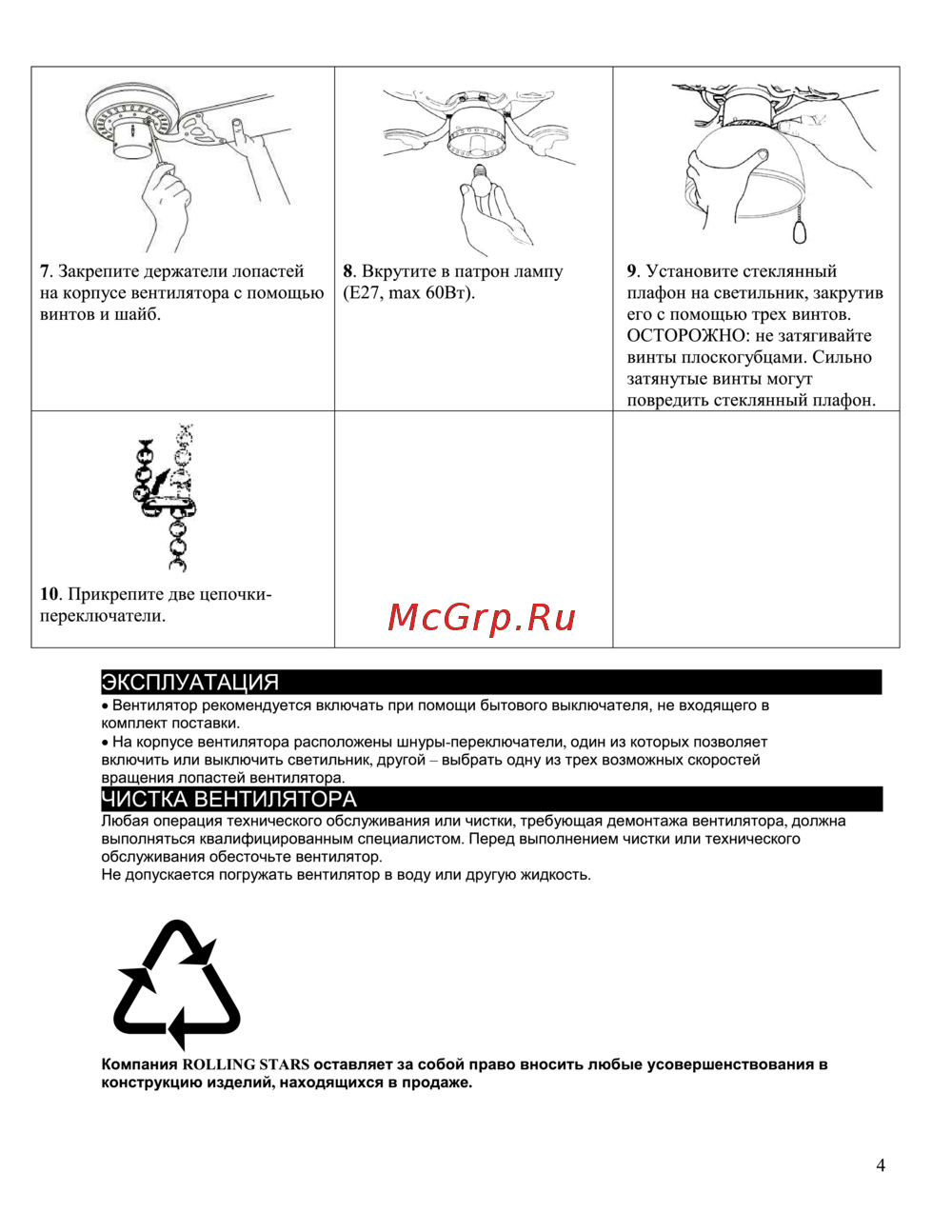 7 Закрепите держатели лопастей на корпусе вентилятора с помощью винтов и шайб 8 Вкрутите в патрон лампу Е27 шах 60Вт 9 Установите стеклянный плафон на светильник закрутив его с помощью трех винтов ОСТОРОЖНО не затягивайте винты плоскогубцами Сильно затянутые винты могут повредить стеклянный плафон 10 Прикрепите две цепочкипереключатели ЭКСПЛУАТАЦИЯ Вентилятор рекомендуется включать при помощи бытового выключателя не входящего в комплект поставки На корпусе вентилятора расположены шнуры переключатели один из которых позволяет включить или выключить светильник другой выбрать одну из трех возможных скоростей вращения лопастей вентилятора _________________________________________________ ЧИСТКА ВЕНТИЛЯТОРА Любая операция технического обслуживания или чистки требующая демонтажа вентилятора должна выполняться квалифицированным специалистом Перед выполнением чистки или технического обслуживания обесточьте вентилятор Не допускается погружать вентилятор в воду или другую жидкость Компания ROLLING STARS оставляет за собой право вносить любые усовершенствования в конструкцию изделий находящихся в продаже 4