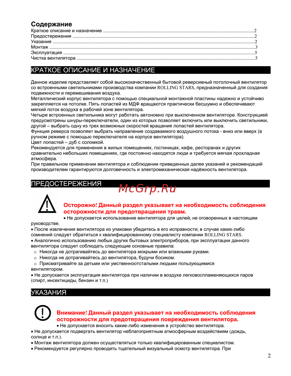 Содержание Краткое описание и назначение 2 Предостережения 2 Указания 2 Монтаж 3 Эксплуатация 5 Чистка вентилятора 5 КРАТКОЕ ОПИСАНИЕ И НАЗНАЧЕНИЕ Данное изделие представляет собой высококачественный бытовой реверсивный потолочный вентилятор со встроенными светильниками производства компании ROLLING STARS предназначенный для создания подвижности и перемешивания воздуха Металлический корпус вентилятора с помощью специальной монтажной пластины надежно и устойчиво закрепляется на потолке Пять лопастей из МДФ вращаются практически бесшумно и обеспечивают мягкий поток воздуха в рабочей зоне вентилятора Четыре встроенных светильника могут работать автономно при выключенном вентиляторе Конструкцией предусмотрены шнуры переключатели один из которых позволяет включить или выключить светильники другой выбрать одну из трех возможных скоростей вращения лопастей вентилятора Функция реверса позволяет выбрать направление создаваемого воздушного потока вниз или вверх в ручном режиме с помощью переключателя на корпусе вентилятора Цвет лопастей дуб с соломкой Рекомендуется для применения в жилых помещениях гостиницах кафе ресторанах и других сравнительно небольших помещениях где постоянно находятся люди и требуется мягкая прохладная атмосфера При правильном применении вентилятора и соблюдении приведенных далее указаний и рекомендаций производителем гарантируются долговечность и электромеханическая надёжность вентилятора ПРЕДОСТЕРЕЖЕНИЯ А Осторожно Данный раздел указывает на необходимость соблюдения осторожности для предотвращения травм Не допускается использование вентилятора для целей не оговоренных в настоящем руководстве После извлечения вентилятора из упаковки убедитесь в его исправности в случае каких либо сомнений следует обратиться к квалифицированному специалисту компании ROLLING STARS Аналогично использованию любых других бытовых электроприборов при эксплуатации данного вентилятора следует соблюдать следующие основные правила о Никогда не дотрагивайтесь до вентилятора мокрыми или влажными руками о Никогда не дотрагивайтесь до вентилятора будучи босиком о Присматривайте за детьми или умственноотсталыми людьми пользующимися вентилятором Не допускается эксплуатация вентилятора при наличии в воздухе легковоспламеняющихся паров спирт инсектициды бензин и т п УКАЗАНИЯ Внимание Данный раздел указывает на необходимость соблюдения осторожности для предотвращения повреждения вентилятора Не допускается вносить какие либо изменения в устройство вентилятора Не допускается подвергать вентилятор неблагоприятным атмосферным воздействиям дождь солнце и т п Монтаж вентилятора должен осуществляться только квалифицированным специалистом Рекомендуется регулярно проводить тщательный визуальный осмотр вентилятора При 2