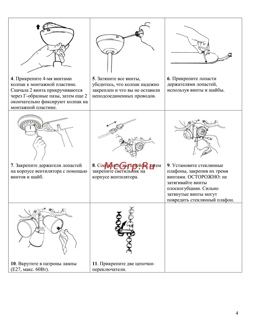 4 Прикрепите 4 мя винтами колпак к монтажной пластине Сначала 2 винта прикручиваются через Г образные пазы затем еще 2 окончательно фиксируют колпак на монтажной пластине 5 Затяните все винты убедитесь что колпак надежно закреплен и что вы не оставили неподсоединенных проводов 6 Прикрепите лопасти держателями лопастей используя винты и шайбы 7 Закрепите держатели лопастей на корпусе вентилятора с помощью винтов и шайб 8 Соедините два шлейфа затем закрепите светильник на корпусе вентилятора 9 Установите стеклянные плафоны закрепив их тремя винтами ОСТОРОЖНО не затягивайте винты плоскогубцами Сильно затянутые винты могут повредить стеклянный плафон 10 Вкрутите в патроны лампы Е27 макс 60Вт 11 Прикрепите две цепочкипереключатели 4