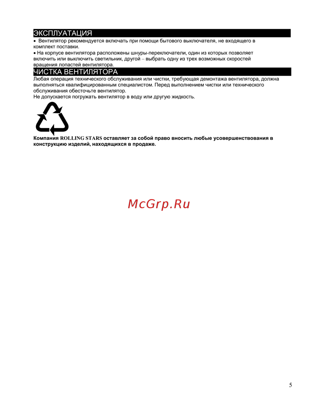 ЭКСПЛУАТАЦИЯ Вентилятор рекомендуется включать при помощи бытового выключателя не входящего в комплект поставки На корпусе вентилятора расположены шнуры переключатели один из которых позволяет включить или выключить светильник другой выбрать одну из трех возможных скоростей вращения лопастей вентилятора _________________________________________________ ЧИСТКА ВЕНТИЛЯТОРА Любая операция технического обслуживания или чистки требующая демонтажа вентилятора должна выполняться квалифицированным специалистом Перед выполнением чистки или технического обслуживания обесточьте вентилятор Не допускается погружать вентилятор в воду или другую жидкость Компания ROLLING STARS оставляет за собой право вносить любые усовершенствования в конструкцию изделий находящихся в продаже 5