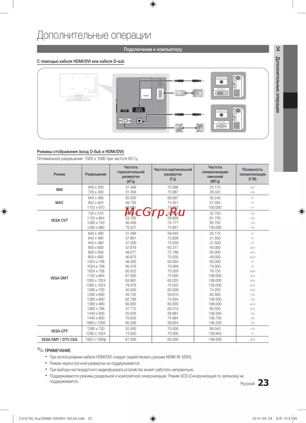 Режимы отображения (вход D-Sub и HDMI/DVI)