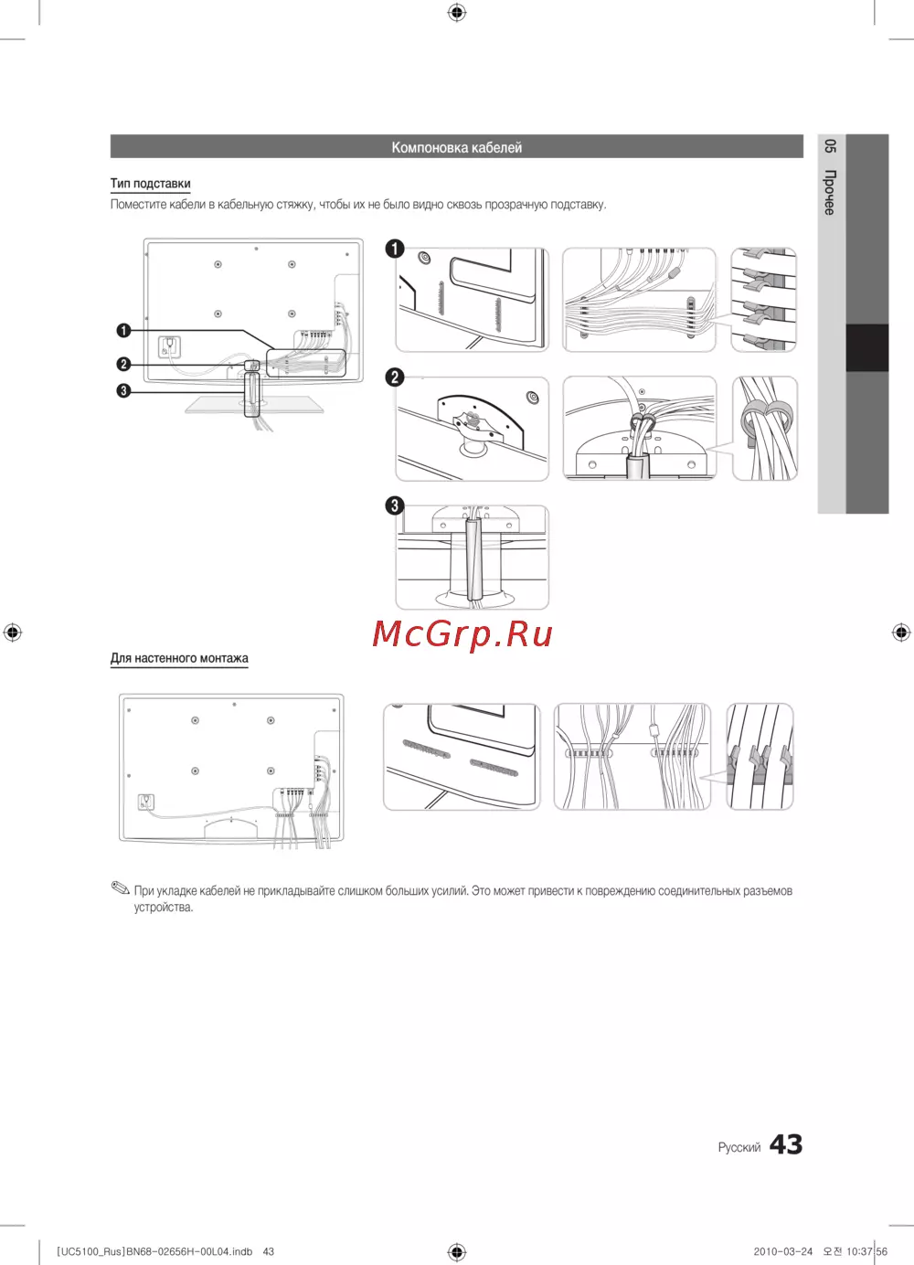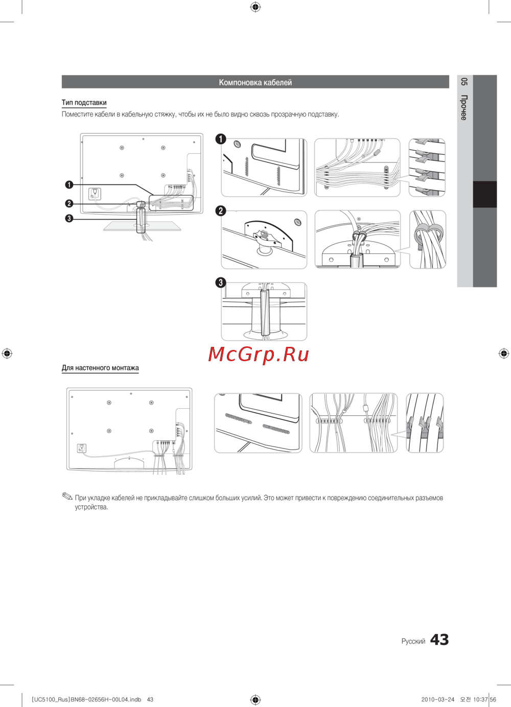 При укладке кабелей не прикладывайте слишком больших усилий. Это может привести к повреждению соединительных разъемов