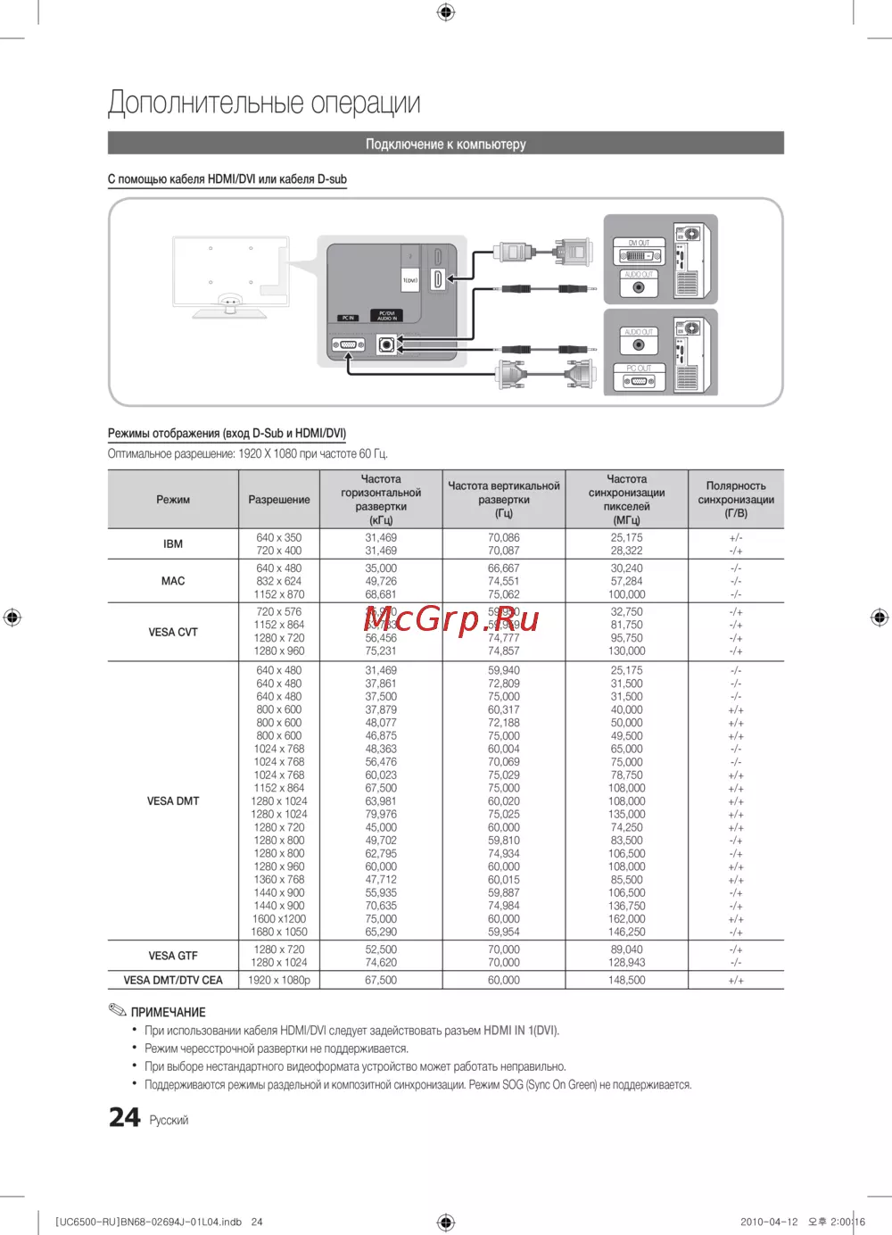 Режимы отображения (вход D-Sub и HDMI/DVI)