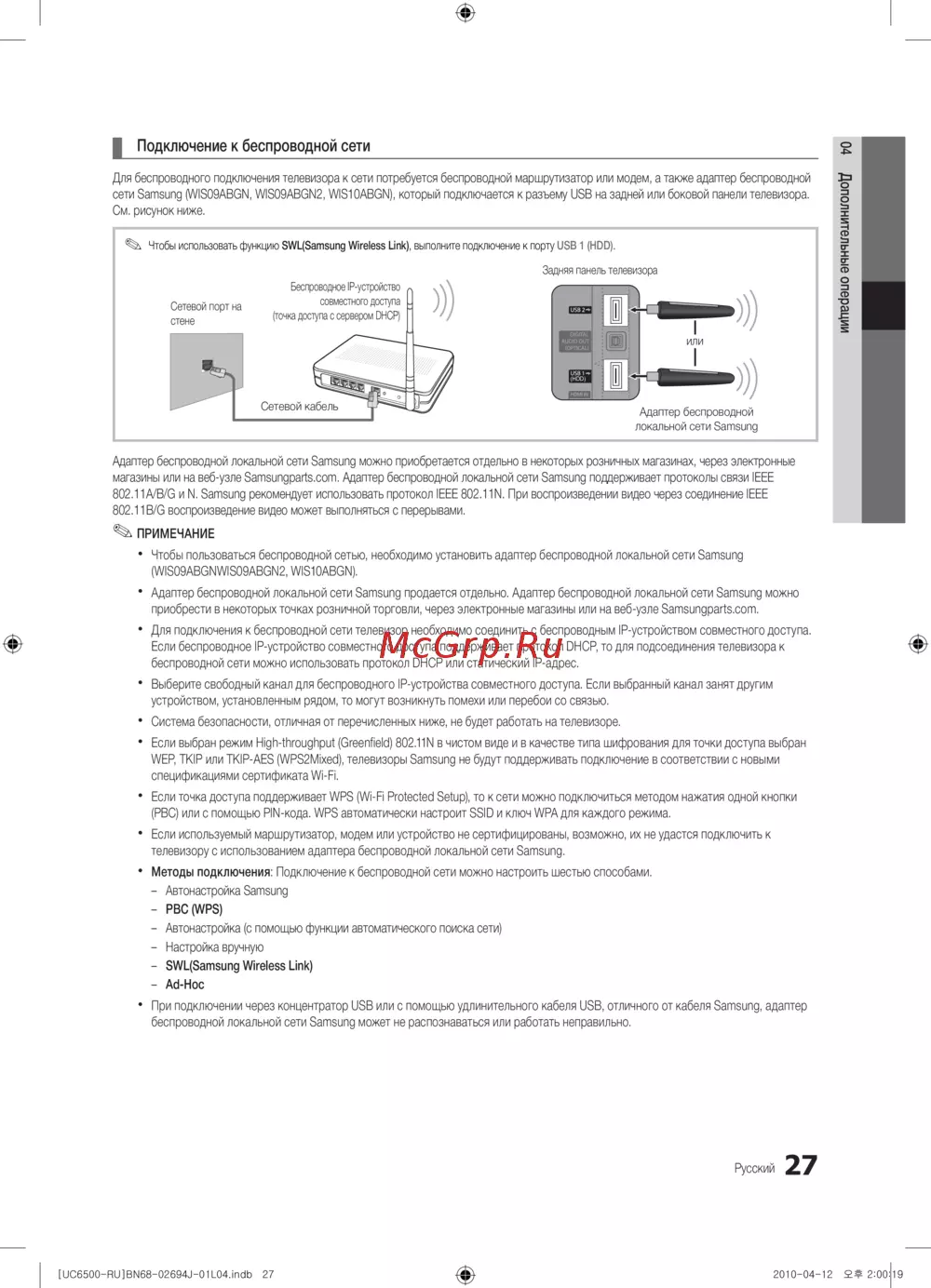 магазины или на веб-узле Samsungparts.com. Адаптер беспроводной локальной сети Samsung поддерживает протоколы связи IEEE