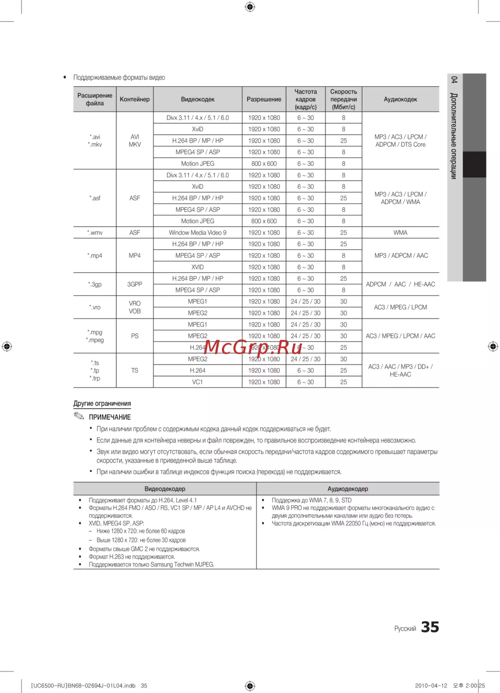 • Форматы H.264 FMO / ASO / RS, VC1 SP / MP / AP L4 и AVCHD не