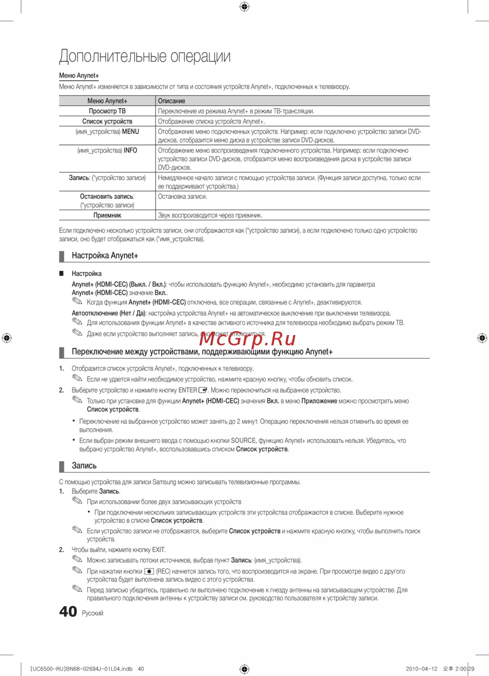 Когда функция Anynet+ (HDMI-CEC) отключена, все операции, связанные с Anynet+, деактивируются.