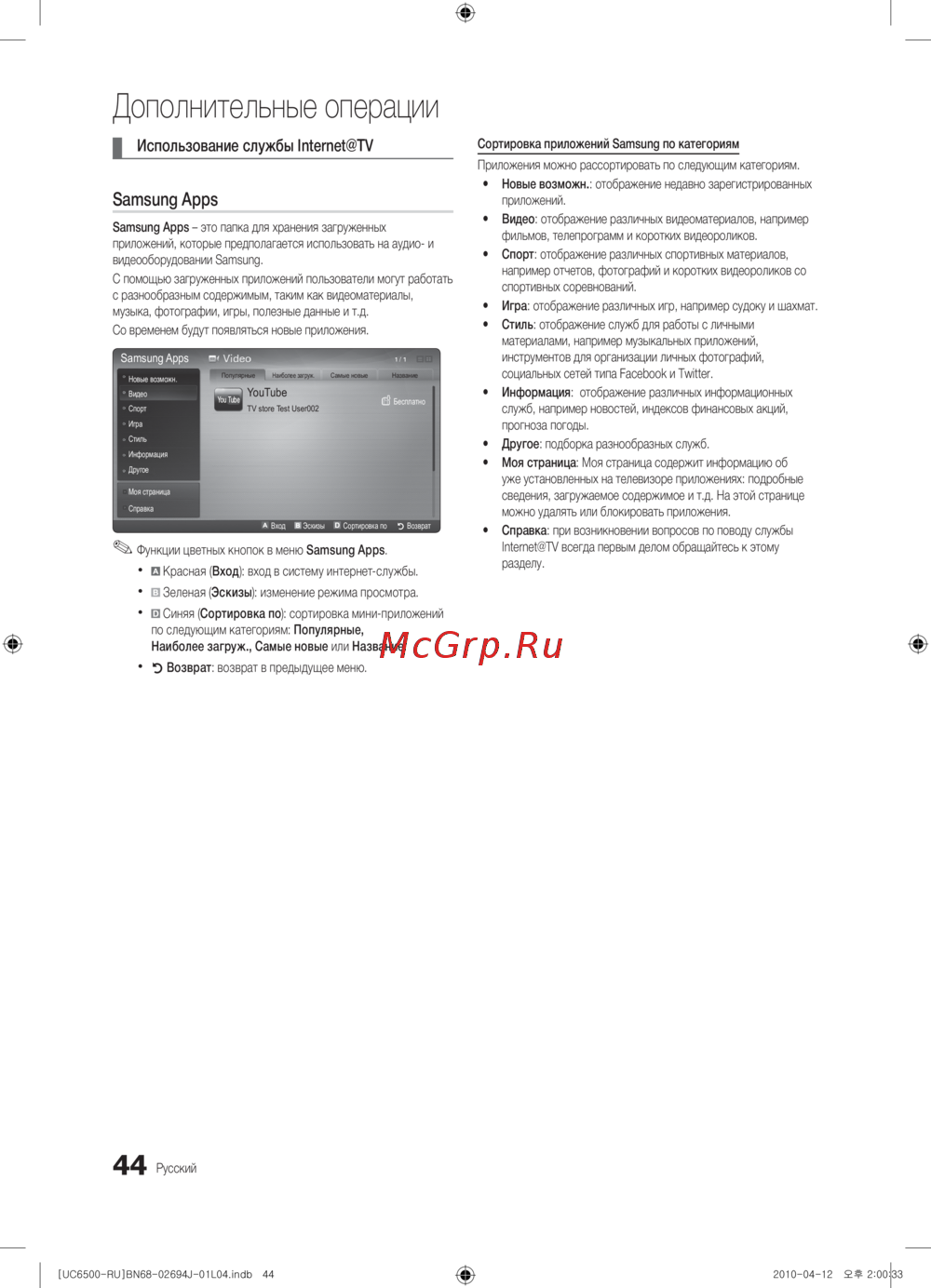 Функции цветных кнопок в меню Samsung Apps.
