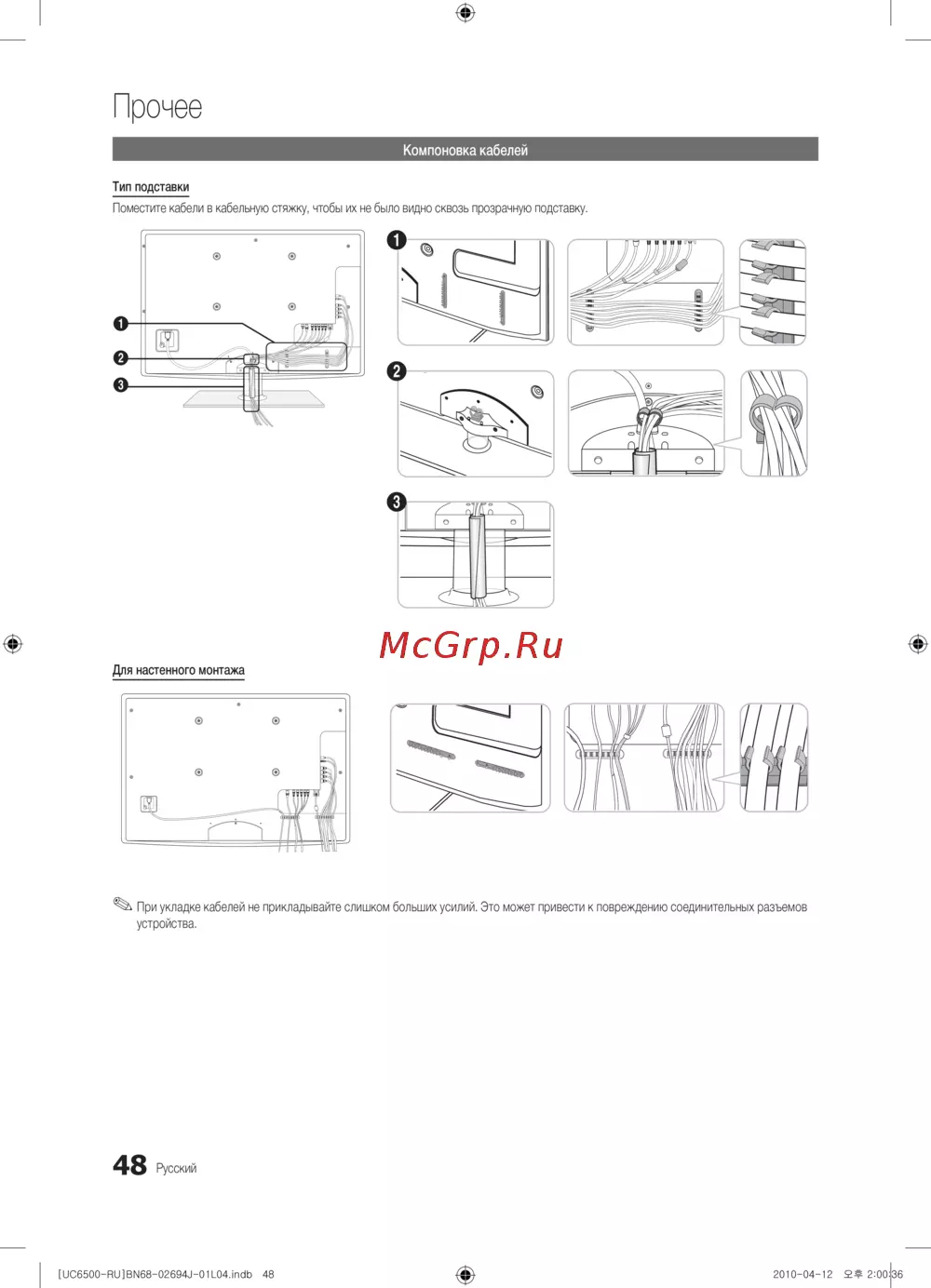 При укладке кабелей не прикладывайте слишком больших усилий. Это может привести к повреждению соединительных разъемов