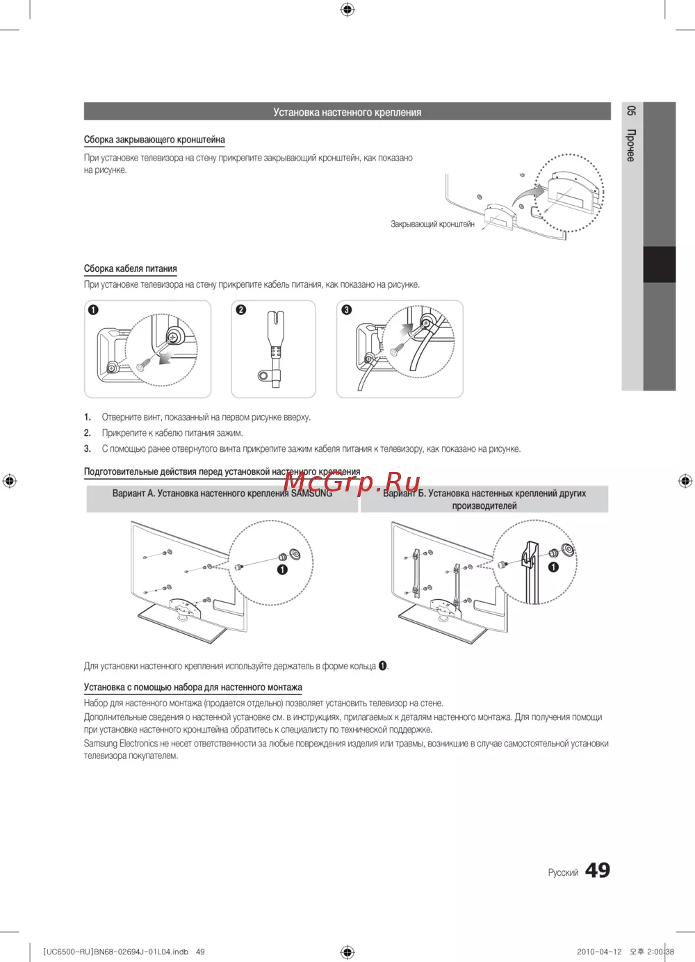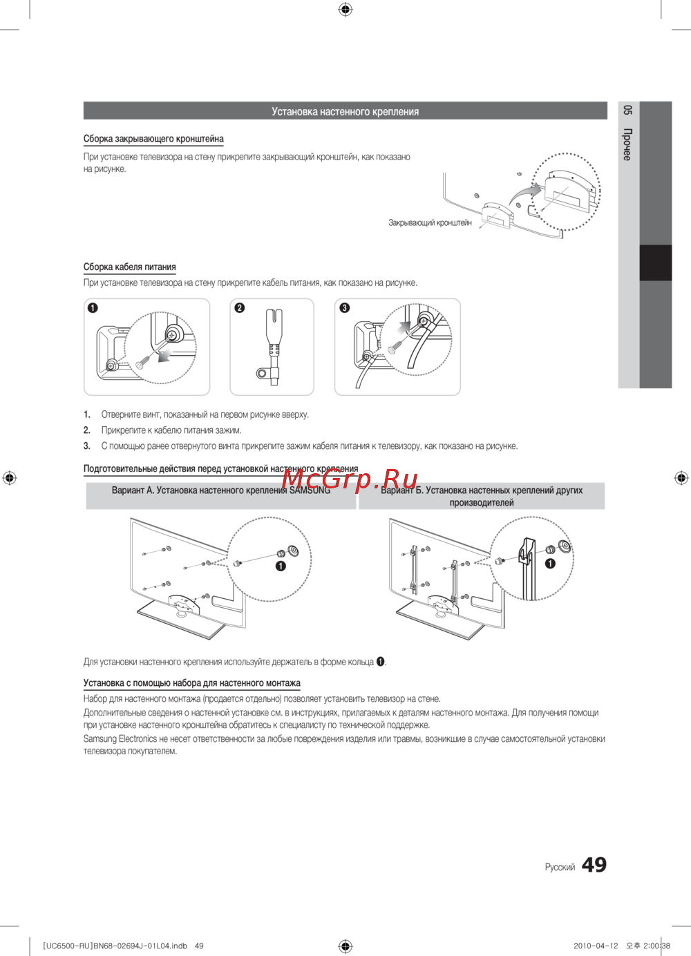 - Установка настенного крепления p.49