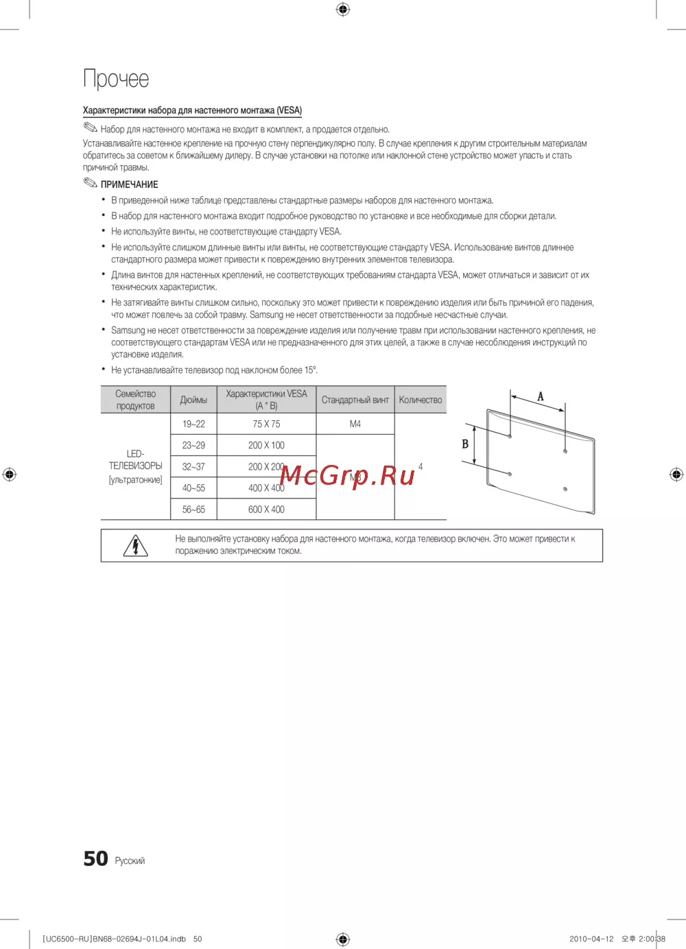 Samsung не несет ответственности за повреждение изделия или получение травм при использовании настенного крепления, не