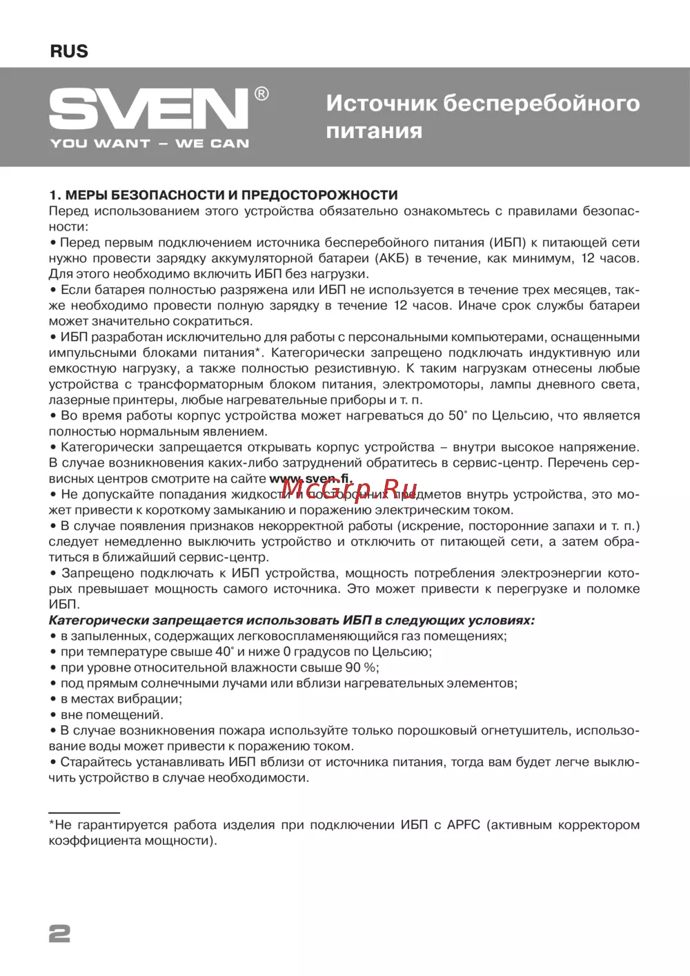 Sven Pro + 1000 — меры безопасности при использовании источника бесперебойного питания [3/25]