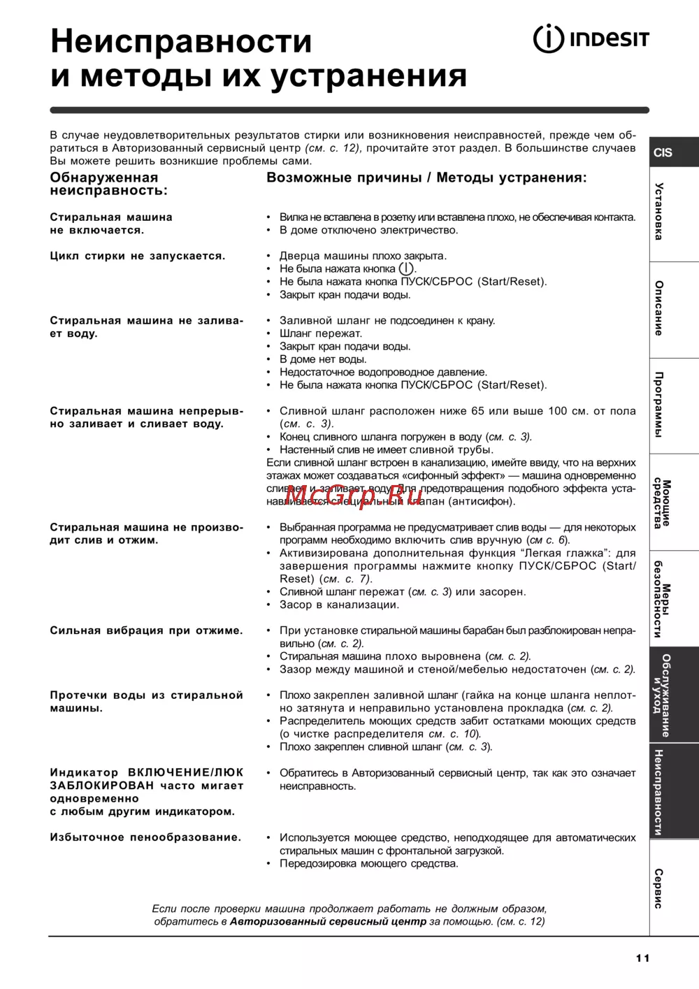 Неисправности и методы их устранения pmoesiT В случае неудовлетворительных результатов стирки или возникновения неисправностей прежде чем об ратиться в Авторизованный сервисный центр см с 12 прочитайте этот раздел В большинстве случаев Вы можете решить возникшие проблемы сами OS Стиральная машина не включается Вилка не вставлена в розетку или вставлена плохо не обеспечивая контакта В доме отключено электричество Цикл стирки не запускается Дверца машины плохо закрыта Не была нажата кнопка Т Не была нажата кнопка ПУСК СБРОС З1аг1 Ре5е1 Закрыт кран подачи воды Стиральная машина не залива ет воду Заливной шланг не подсоединен к крану Шланг пережат Закрыт кран подачи воды В доме нет воды Недостаточное водопроводное давление Не была нажата кнопка ПУСК СБРОС З1аг1 Ре5е1 Стиральная машина непрерыв но заливает и сливает воду Сливной шланг расположен ниже 65 или выше 100 см от пола см с 3 Конец сливного шланга погружен в воду см с 3 Настенный слив не имеет сливной трубы Если сливной шланг встроен в канализацию имейте ввиду что на верхних этажах может создаваться сифонный эффект машина одновременно сливает и заливает воду Для предотвращения подобного эффекта уста навливается специальный клапан антисифон Стиральная машина не произво дит слив и отжим Сильная вибрация при отжиме Протечки воды из стиральной машины Описание Возможные причины I Методы устранения Программы Моющие средства Меры безопасности МцСФПЧШЯ Выбранная программа не предусматривает слив воды для некоторых программ необходимо включить слив вручную см с 6 Активизирована дополнительная функция Легкая глажка для завершения программы нажмите кнопку ПУСК СБРОС Start Reset см с 7 Сливной шланг пережат см с 3 или засорен Засор в канализации При установке стиральной машины барабан был разблокирован непра вильно см с 2 Стиральная машина плохо выровнена см с 2 Зазор между машиной и стеной мебелью недостаточен см с 2 Индикатор ВКЛЮЧЕНИЕ ЛЮК ЗАБЛОКИРОВАН часто мигает одновременно с любым другим индикатором Избыточное пенообразование Установка Обнаруженная неисправность Плохо закреплен заливной шланг гайка на конце шланга неплот но затянута и неправильно установлена прокладка см с 2 Распределитель моющих средств забит остатками моющих средств о чистке распределителя см с 10 Плохо закреплен сливной шланг см с 3 Обратитесь в Авторизованный сервисный центр так как это означает неисправность Сервис Используется моющее средство неподходящее для автоматических стиральных машин с фронтальной загрузкой Передозировка моющего средства Если после проверки машина продолжает работать не должным образом обратитесь в Авторизованный сервисный центр за помощью см с 12 11