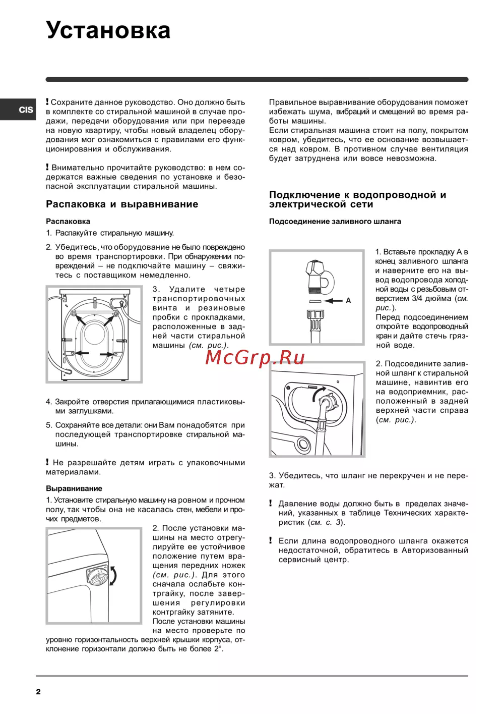 Установка Сохраните данное руководство Оно должно быть в комплекте со стиральной машиной в случае про дажи передачи оборудования или при переезде на новую квартиру чтобы новый владелец обору дования мог ознакомиться с правилами его функ ционирования и обслуживания СБ Правильное выравнивание оборудования поможет избежать шума вибраций и смещений во время ра боты машины Если стиральная машина стоит на полу покрытом ковром убедитесь что ее основание возвышает ся над ковром В противном случае вентиляция будет затруднена или вовсе невозможна Внимательно прочитайте руководство в нем со держатся важные сведения по установке и безо пасной эксплуатации стиральной машины Распаковка и выравнивание Подключение к водопроводной и электрической сети Распаковка Подсоединение заливного шланга 1 Распакуйте стиральную машину 2 Убедитесь что оборудование не было повреждено во время транспортировки При обнаружении по вреждений не подключайте машину свяжи тесь с поставщиком немедленно 1 Вставьте прокладку А в конец заливного шланга и наверните его на вы вод водопровода холод ной воды с резьбовым от верстием 3 4 дюйма см рис Перед подсоединением откройте водопроводный кран и дайте стечь гряз ной воде 3 Удалите четыре транспортировочных винта и резиновые пробки с прокладками расположенные в зад ней части стиральной машины см рис 2 Подсоедините залив ной шланг к стиральной машине навинтив его на водоприемник рас положенный в задней верхней части справа см рис 4 Закройте отверстия прилагающимися пластиковы ми заглушками 5 Сохраняйте все детали они Вам понадобятся при последующей транспортировке стиральной ма шины Не разрешайте материалами детям играть с упаковочными Выравнивание 1 Установите стиральную машину на ровном и прочном полу так чтобы она не касалась стен мебели и про2 После установки ма шины на место отрегу лируйте ее устойчивое положение путем вра щения передних ножек см рис Для этого сначала ослабьте кон тргайку после завер шения регулировки контргайку затяните После установки машины на место проверьте по уровню горизонтальность верхней крышки корпуса от клонение горизонтали должно быть не более 2 2 3 Убедитесь что шланг не перекручен и не пере жат Давление воды должно быть в пределах значе ний указанных в таблице Технических характе ристик см с 3 Если длина водопроводного шланга окажется недостаточной обратитесь в Авторизованный сервисный центр