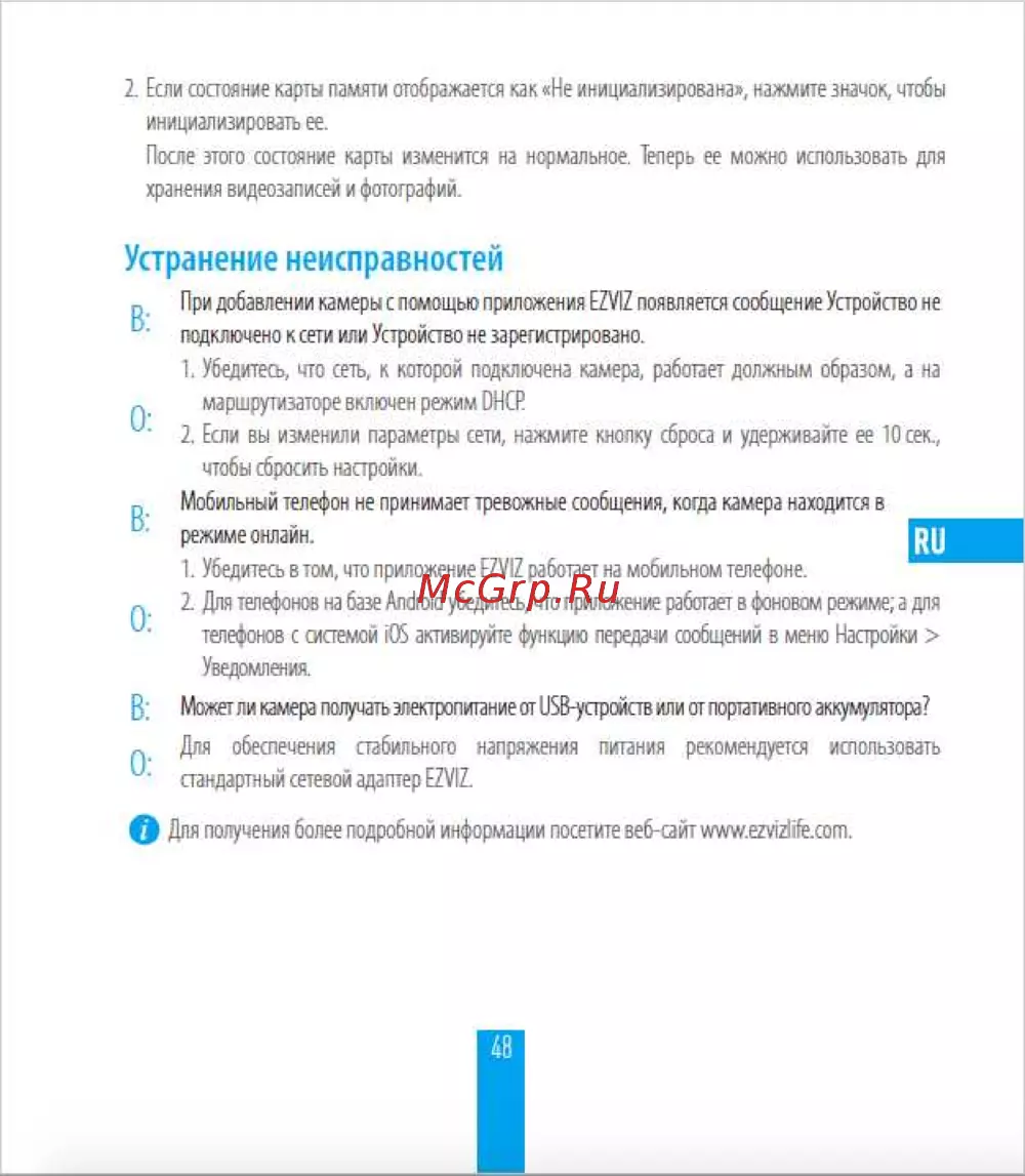 2 Если состояние карты памяти отображается как Не инициализирована нажмите значок чтобы инициализировать ее После этого состояние карты изменится на нормальное Теперь ее можно использовать для хранения видеозаписей и фотографий Устранение неисправностей Р При добавлении камеры с помощью приложения EZVIZ появляется сообщение Устройство не подключено к сети или Устройство не зарегистрировано 1 Убедитесь что сеть к которой подключена камера работает должным образом а на маршрутизаторе включен режим DHCP 2 Если вы изменили параметры сети нажмите кнопку сброса и удерживайте ее 10 сек чтобы сбросить настройки р Мобильный телефон не принимает тревожные сообщения когда камера находится в режиме онлайн 1 Убедитесь в том что приложение EZVIZ работает на мобильном телефоне Для телефонов на базе Android убедитесь что приложение работает в фоновом режиме а для телефонов с системой iOS активируйте функцию передачи сообщений в меню Настройки Уведомления В Может ли камера получать электропитание от USB устройств или от портативного аккумулятора Для обеспечения стабильного напряжения питания рекомендуется стандартный сетевой адаптер EZVIZ о Для получения более подробной информации посетите веб сайт www ezvizlife com использовать