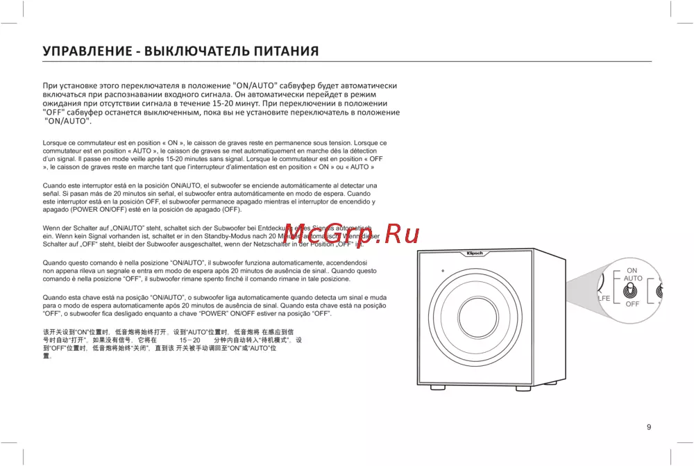 - При установке этого переключателя в положение on auto сабвуфер будет автоматически включаться при распознавании входного сигнала он автоматически перейдет в режим ожидания при отсутствии сигнала в течение 15 20 минут при переключении в положении off сабвуфер останется выключенным пока вы не установите переключатель в положение on auto p.8