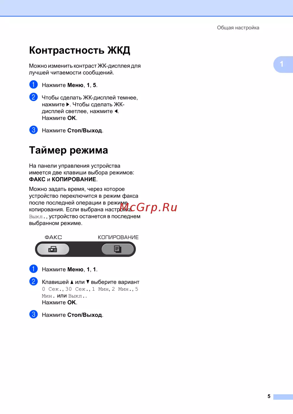 Brother FAX-2940R — настройка контрастности и таймера на ЖК-дисплее устройства [11/59]