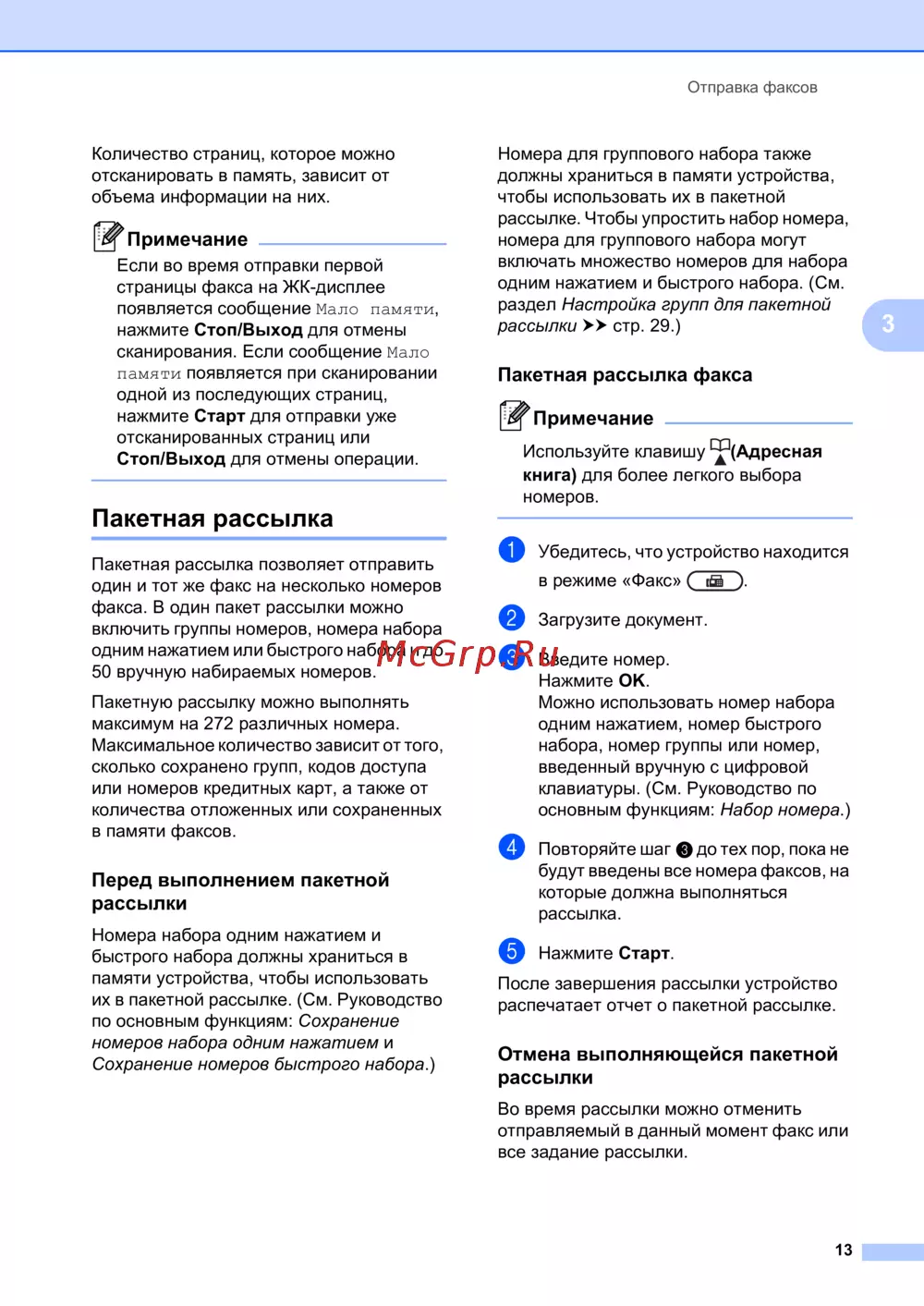 Узнайте, как отправлять факсы и использовать пакетную рассылку для отправки на несколько номеров. Простые шаги и советы по управлению памятью устройства.