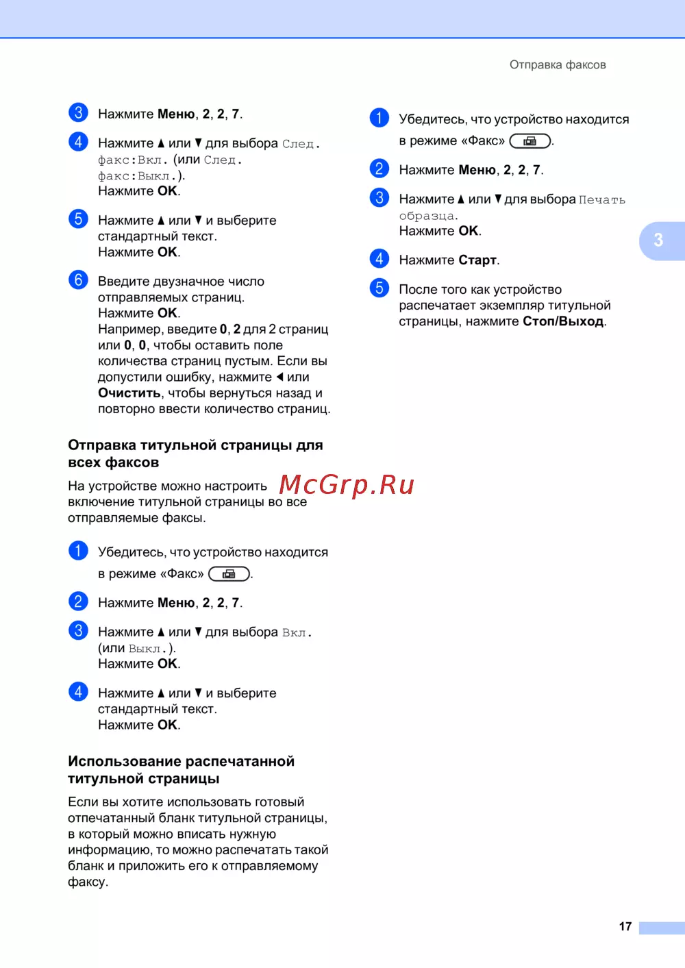 Узнайте, как отправлять факсы и настраивать титульные страницы. Простые шаги для выбора текста и ввода количества страниц. Легко и удобно!