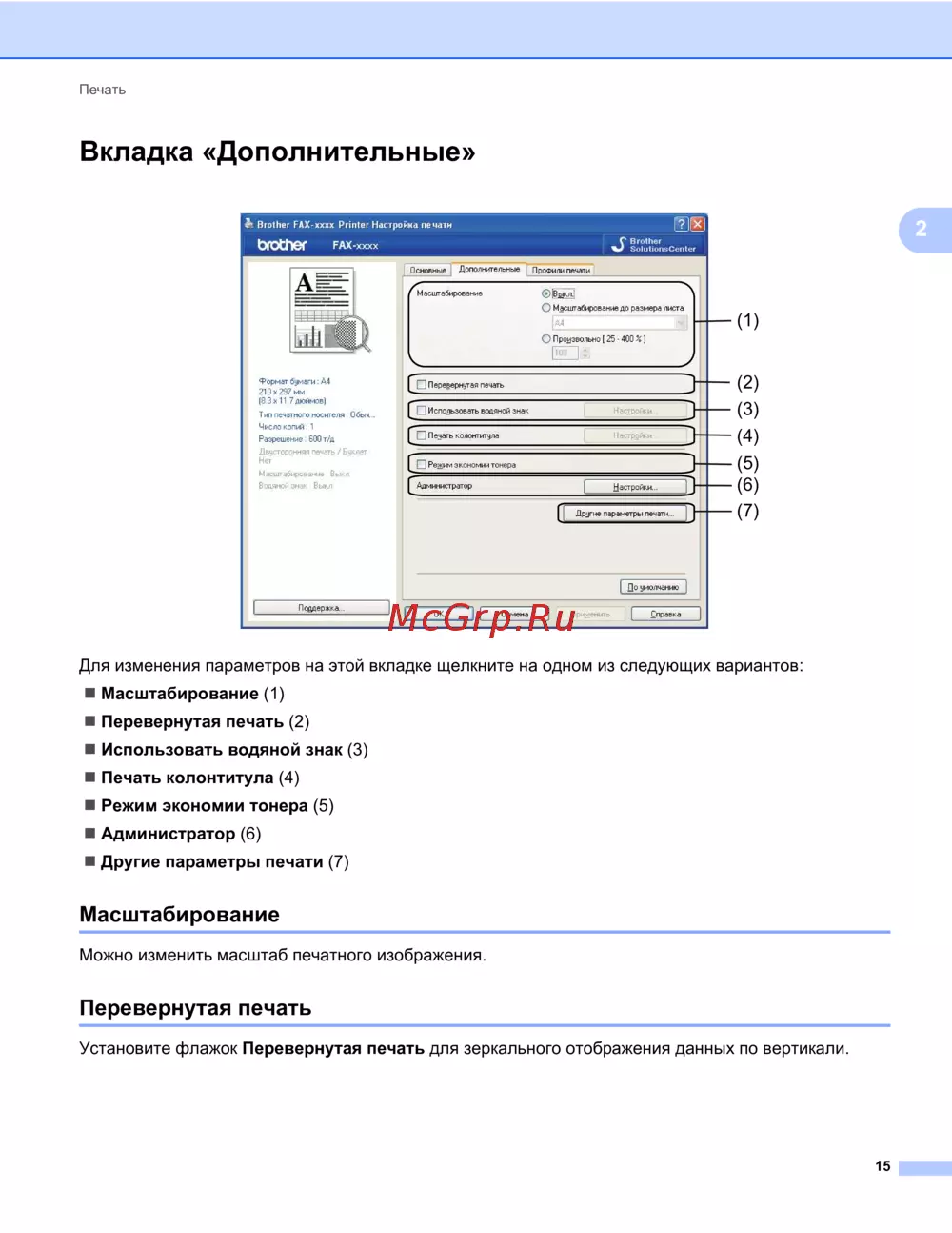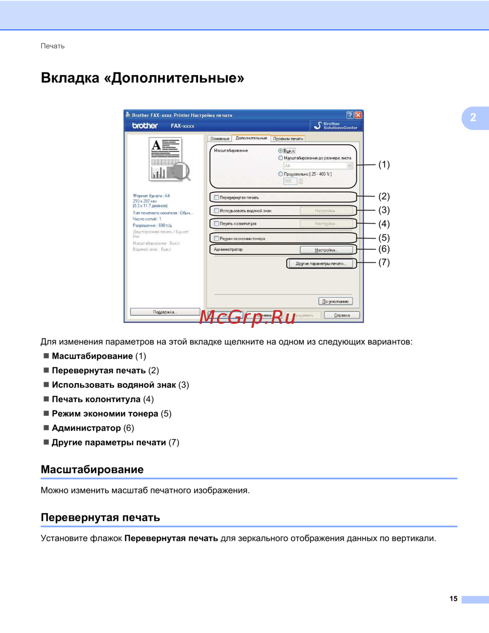 Brother FAX-2940R — настройки печати: масштабирование и дополнительные параметры [21/89]