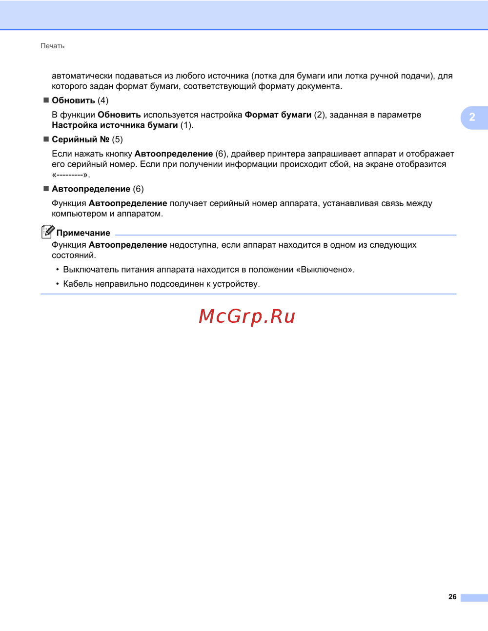 Узнайте о функциях автоматической подачи бумаги и обновления настроек принтера. Получите информацию о серийном номере и возможных сбоях в работе устройства.