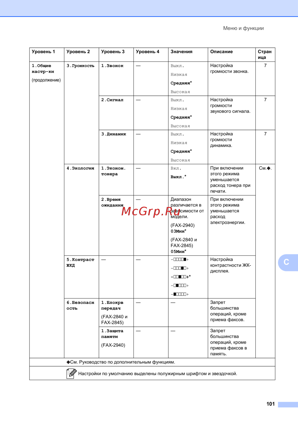 - Настройки по умолчанию выделены полужирным шрифтом и звездочкой p.108