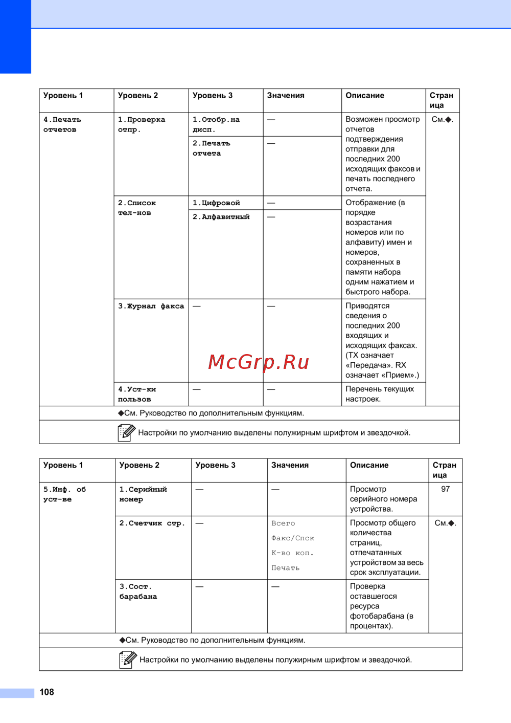 - Настройки по умолчанию выделены полужирным шрифтом и звездочкой p.108