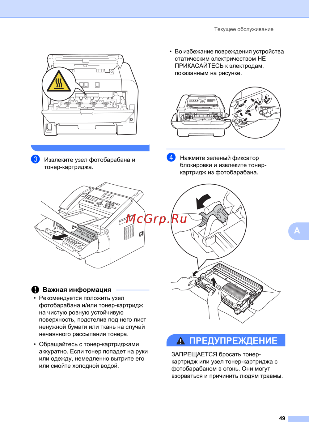Узнайте, как правильно извлекать и обслуживать узел фотобарабана и тонер-картридж. Следуйте рекомендациям для безопасного обращения и предотвращения повреждений.